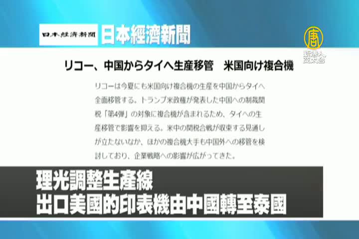 【新唐人亞太台 2019 年 05 月 16 日訊】來看到日本經濟新聞報導:日本事務機器及光學機器製造商理光調整生產線,出口至美國的印表機由中國轉移至泰國。