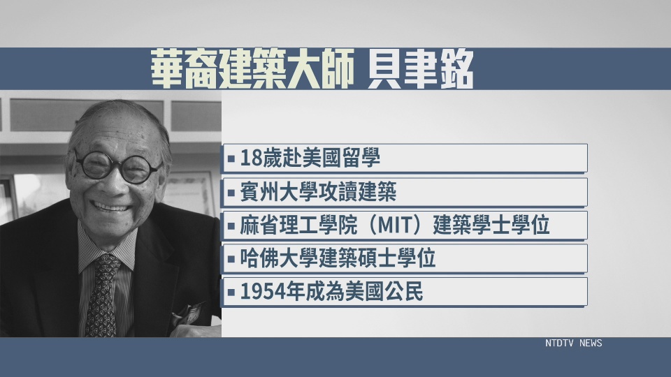 英國廣播公司BBC主播:「這位打造了許多世界著名建築,包括巴黎羅浮宮的玻璃金字塔的設計師去世,享年102歲。這位是華裔建築大師貝聿銘,以他前瞻的思想和設計聞名於世。」貝聿銘1917年出生於中國廣州,父親貝祖貽曾擔任中華民國央行總裁,也是中國銀行創辦人之一。18歲赴美國留學的他,在賓州大學攻讀建築,之後取得麻省理工學院(MIT)建築學士學位,以及哈佛大學建築碩士學位,1954年成為美國公民,也在美國建造了許多著名建築。美國國家廣播公司地方電視台WKYC主播:「他設計了我們美國的搖滾名人堂、羅浮宮的玻璃金字塔、華盛頓國家藝廊的西棟建築,很遺憾他過世了,但這真是個傳奇。」貝聿銘因父親的關係,曾長居台灣。其中在台灣最著名的建築設計,為東海大學路思義教堂。另外,位於台灣的新北市八里焚化廠、以及新竹的新竹市焚化廠,都是出自貝聿銘的設計。