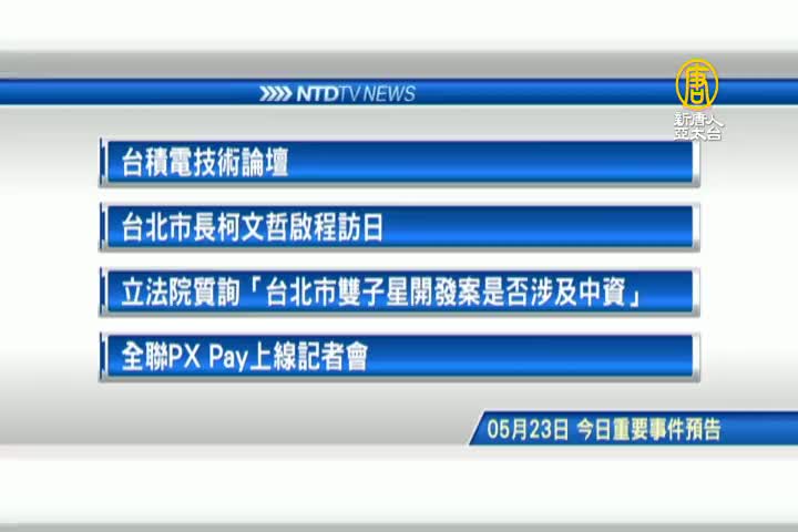 【新唐人亞太台 2019 年 05 月 23 日訊】接著看到,今天,5月23日,星期四 ,有哪些重要活動。首先是,產業焦點,台積電技術論壇今天登場。政治話題,台北市長柯文哲啟程訪日。另外,立法院今天將針對「台北市雙子星開發案是否涉及中資」,質詢經濟與陸委會官員。最後是,通路商攻自有支付,全聯超市,舉辦PX Pay上線記者會。