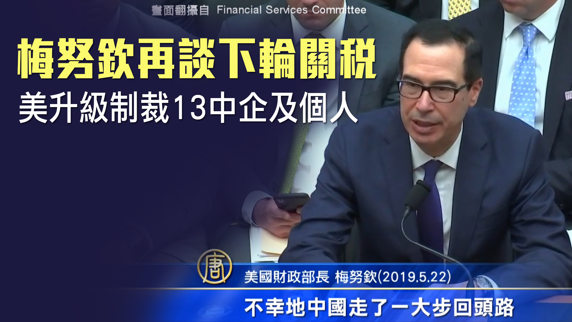 【新唐人亞太台 2019 年 05 月 23 日訊】新聞一開始,帶您鎖定。美國商務部將華為等中企列入黑名單後,美國國務院今天(23日)再宣布,對13個中企或個人實施制裁。而美中除了科技戰之外,繼續帶您關注美中貿易談判本身的最新進展。美國財政部長梅努欽(22號)表示,如果中方想要重啟談判,就必須以先前談判的成果為基礎,進行談判。