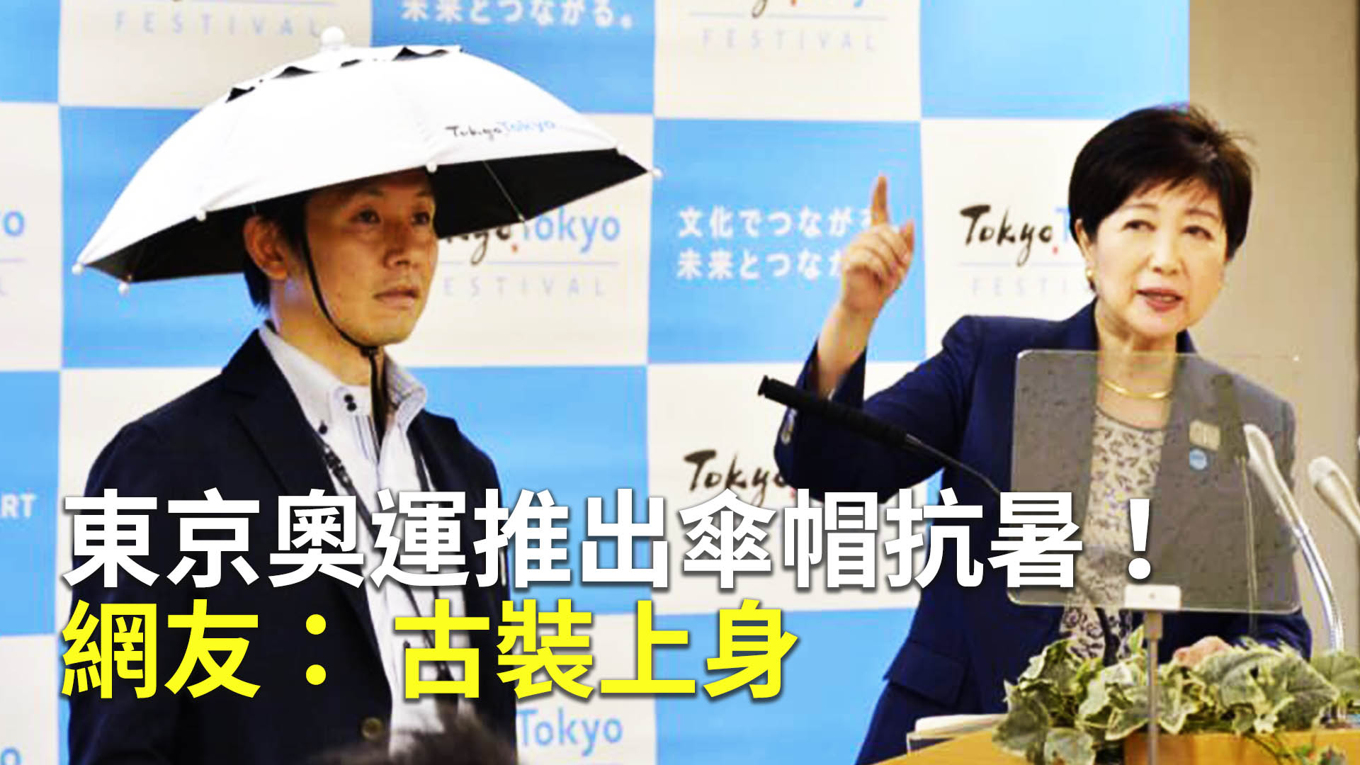日前,東京都知事小池百合子公開介紹這種傘帽,同時也請一名男職員在一旁做示範。