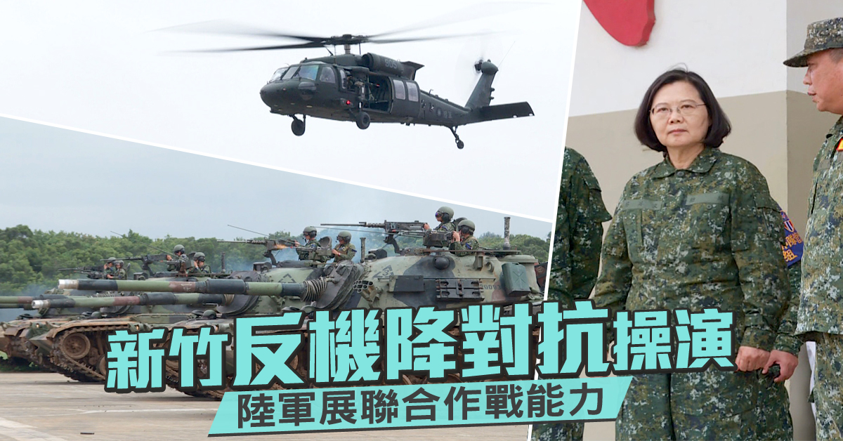 【新唐人亞太台 2019 年 05 月 29 日訊】接著看到,總統蔡英文今天前往新竹湖口,視導國軍的「反機降對抗操演」,此次操演動員官兵200多人,並出動阿帕契攻擊直升機、黑鷹直升機、雲豹甲車等武器,驗證國軍聯合作戰的反機降能力。
