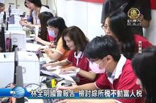 【新唐人亞太台 2019 年 05 月 31 日訊】今天是5月31日,也是綜合所得稅,報稅截止日最後一天,財政部長蘇建榮,周五下午視察台北國稅局稽徵所,視察報稅情況,尤其今年多項扣除額大幅提高,減稅效果,民眾是相當有感。