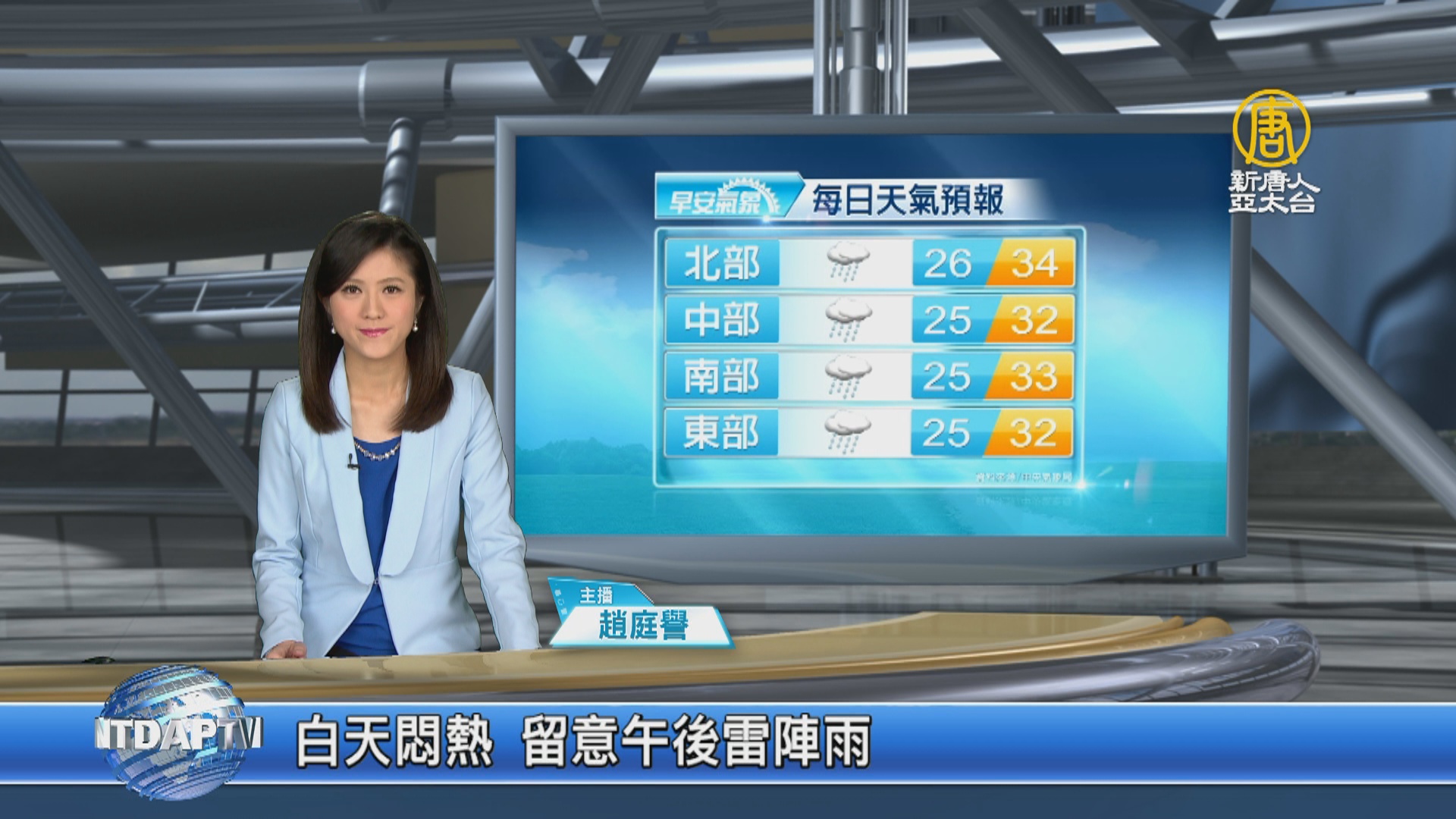 【新唐人亞太台 2019 年 06 月 04 日訊】歡迎您收看6月4日的早安新唐人,我是趙庭譽,先來帶您關心今天的天氣情況。今天各地還是容易有雷陣雨發生的機率,各地高溫普遍在32到34度。從明天星期三,一直到星期六,水氣將會更少。帶您一起來看到國際媒體重要訊息。