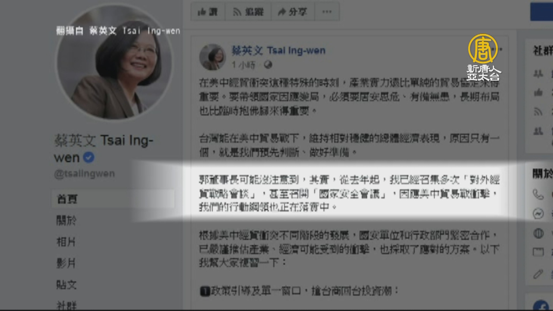 而蔡英文總統,下午也在臉書表示,從去年開始,政府已經多次召集對外經貿戰略會談,甚至召開「國家安全會議」,因應美中貿易戰衝擊。蔡英文並提出三大結論,表示「每一天都用最完善的準備面對挑戰」、「歡迎郭董事長一起努力」。