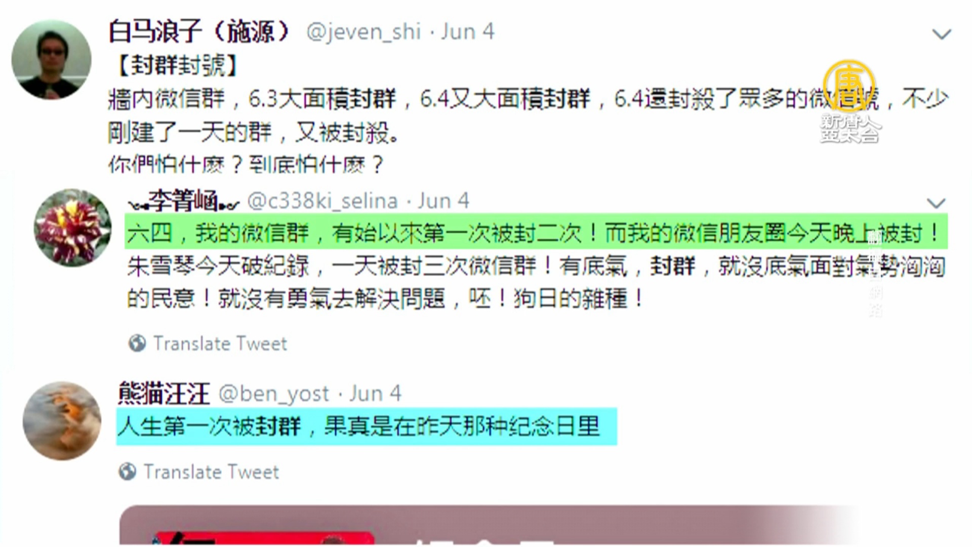 【新唐人亞太台 2019 年 06 月 07 日訊】六四30周年紀念日前後,中共對網路的封殺達到了前所未有的驚人地步,大量微信公眾號、微信群和微信號被封或被屏蔽,並擴展到了海外,推特等社交媒體帳號也被凍結。網友戲稱,中國進入封建新時代,也有人稱之為「網路屠殺」。