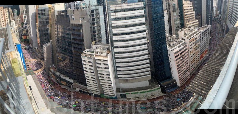 在高空可見,參加遊行的市民逼滿整個銅鑼灣。而在起點、乃至中途,仍有大量市民等著加入抗議人潮。(李逸/大紀元)