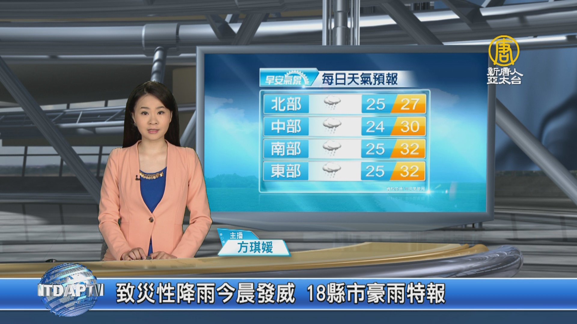 【新唐人亞太台 2019 年 06 月 11 日訊】歡迎您收看6月11日的早安新唐人,我是方琪媛,先來帶您關心今天的天氣情況。今天全台18縣市豪雨特報,鋒面今天清晨進入北部陸地,下午則換中南部,未來一周受鋒面影響全台都有雨;氣象局警告,這是致災性降雨系統,提醒觀眾朋友特別留意。帶您一起來看到國際媒體重要訊息。