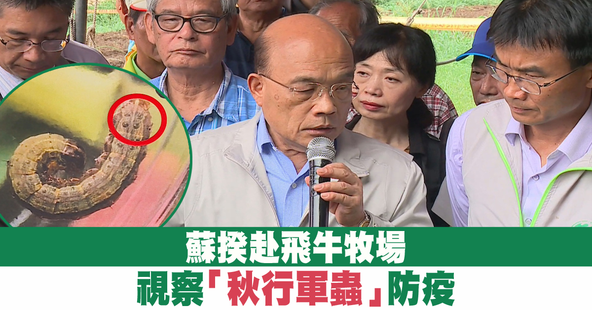 防堵規格視同作戰,行政院長蘇貞昌下午到苗栗飛牛牧場,視察秋行軍蟲防堵的情況,因為一旦害蟲入侵台灣,危害恐比非洲豬瘟還要大。