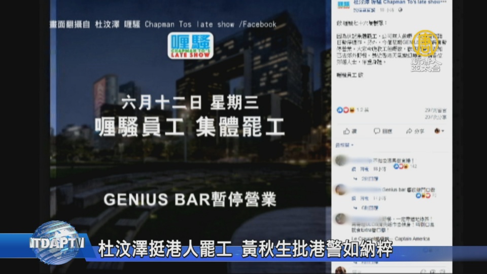 【新唐人亞太台 2019 年 06 月 12 日訊】《逃犯條例》原定在今天進行二讀,引發香港民眾罷工抗議,而香港藝人也在臉書支持罷工行動。香港藝人杜汶澤旗下的網路電視頻道,在臉書公告,員工集體罷工,這個星期暫停營業。還鼓勵網友今晚下班可以約三五好友「去郊外野餐」,還叮嚀各位「郊遊人士」保重身體。另外,昨晚港警在地鐵金鐘站和中環站攔查民眾,搜查背包、提袋,是否藏有違禁品,香港藝人黃秋生將事件照片與1933年德國納粹對比,在臉書寫道「Hello darkness my old friend」。