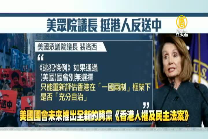 【新唐人亞太台 2019 年 06 月 13 日訊】港人反送中大規模抗議,是又一度印證香港一國兩制失敗。美國眾議院議長裴洛西,在11號深夜發出聲明,表示:倘若逃犯條例通過,美國國會別無選擇,只能重新評估香港在一國兩制下,是否有「充份自治」;同時期待共和黨籍參議員魯比奧(Marco Rubio)未來幾日推出跨黨派的《香港人權與民主法案》。