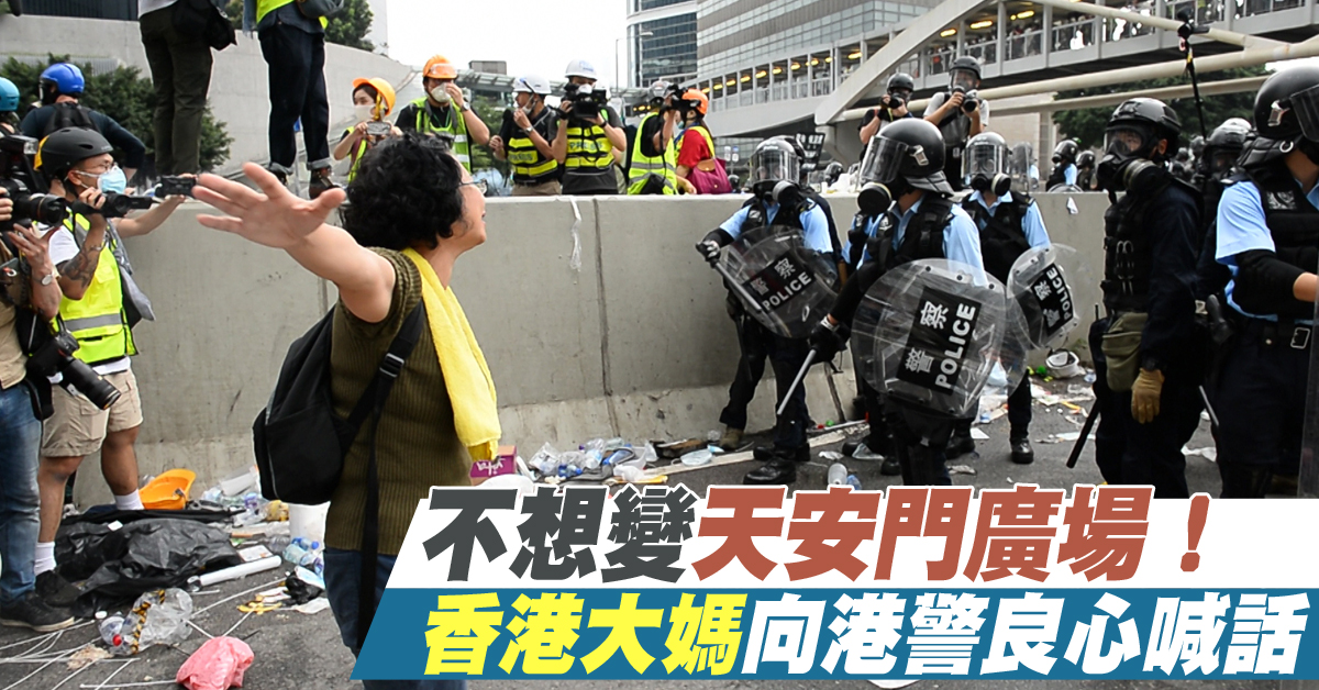香港大媽VS.香港警察VS.群眾:「不要,不要,他們(警察)也只是在工作,(警察:你不要再走過來了)不要阿,不需要,我不想這裡變成天安門廣場啊!我不想這裡變成天安門廣場啊。」