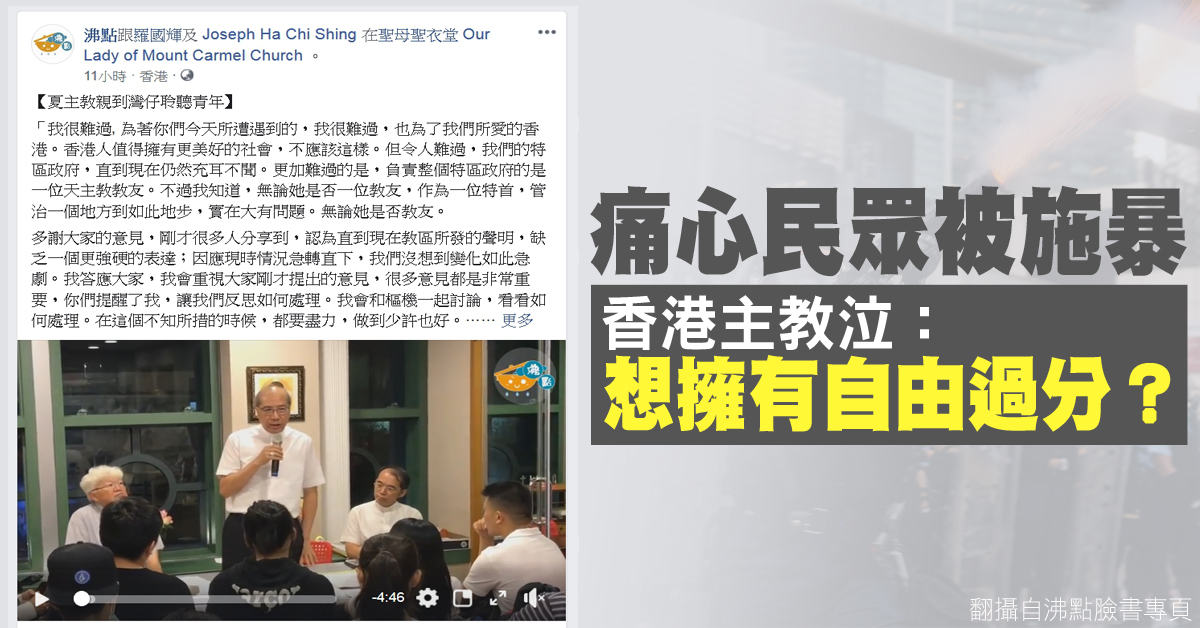 痛心民眾被施暴 港主教泣:想擁有自由過分?