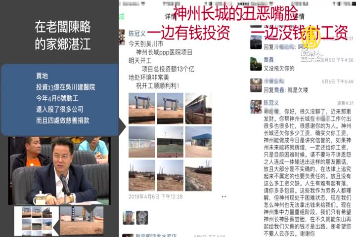 在工人被欠薪的期間,「神州長城」仍然在大手筆的投資,在老闆陳略的家鄉湛江買地,投資13億在吳川建醫院,今年4月6號動工,還入股了很多公司,而且四處做慈善捐款。