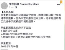 【21:58】學生動源回應政府新聞稿,要求政府撤回修例,撤銷定性6.12示威為暴動,以及撤銷所有因反送中被控市民的控罪,並呼籲市民繼續留守金鐘。