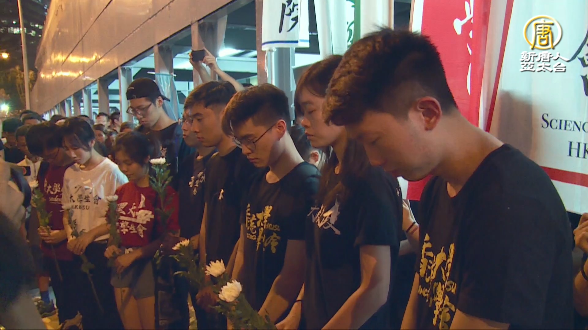 【新唐人亞太台 2019 年 06 月 17 日訊】好,這次民陣宣布,遊行總人數是「200萬+1」,原因就是,週六晚,香港一名男子在太古廣場上懸掛反送中布條後,不幸墜樓身亡。警方在現場找到1封遺書,有匿名消防員留言「不要為送中條例作出犧牲,堅持到最後,不撤回不放棄,一同享受自由的成果」,昨天晚間,香港大專院校的學生會代表,悼念亡魂。