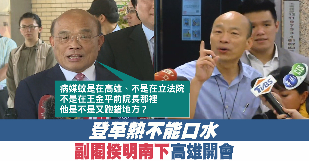 行政院長 蘇貞昌:「市長他在當,責任要我扛,天下有這麼賴皮的事?病媒蚊是在高雄、不是在立法院、不是在王金平前院長那裡,他是不是又跑錯地方?連一隻蚊子都治不好,還要到處趴趴走,說要治國,這會不會太荒唐?」