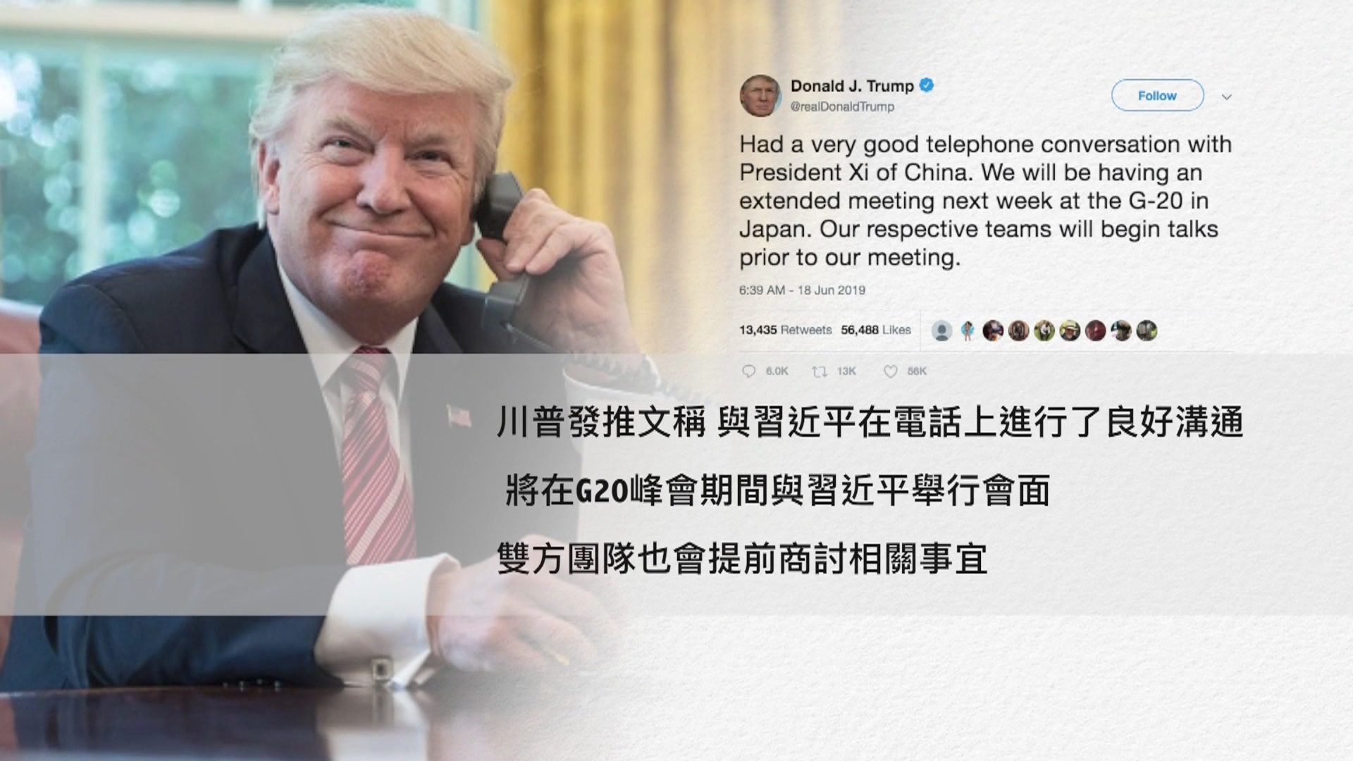 川普總統週二發推文稱,與習近平在電話上進行了良好溝通,將在G20峰會期間與習近平舉行會面,雙方團隊也會提前商討相關事宜。