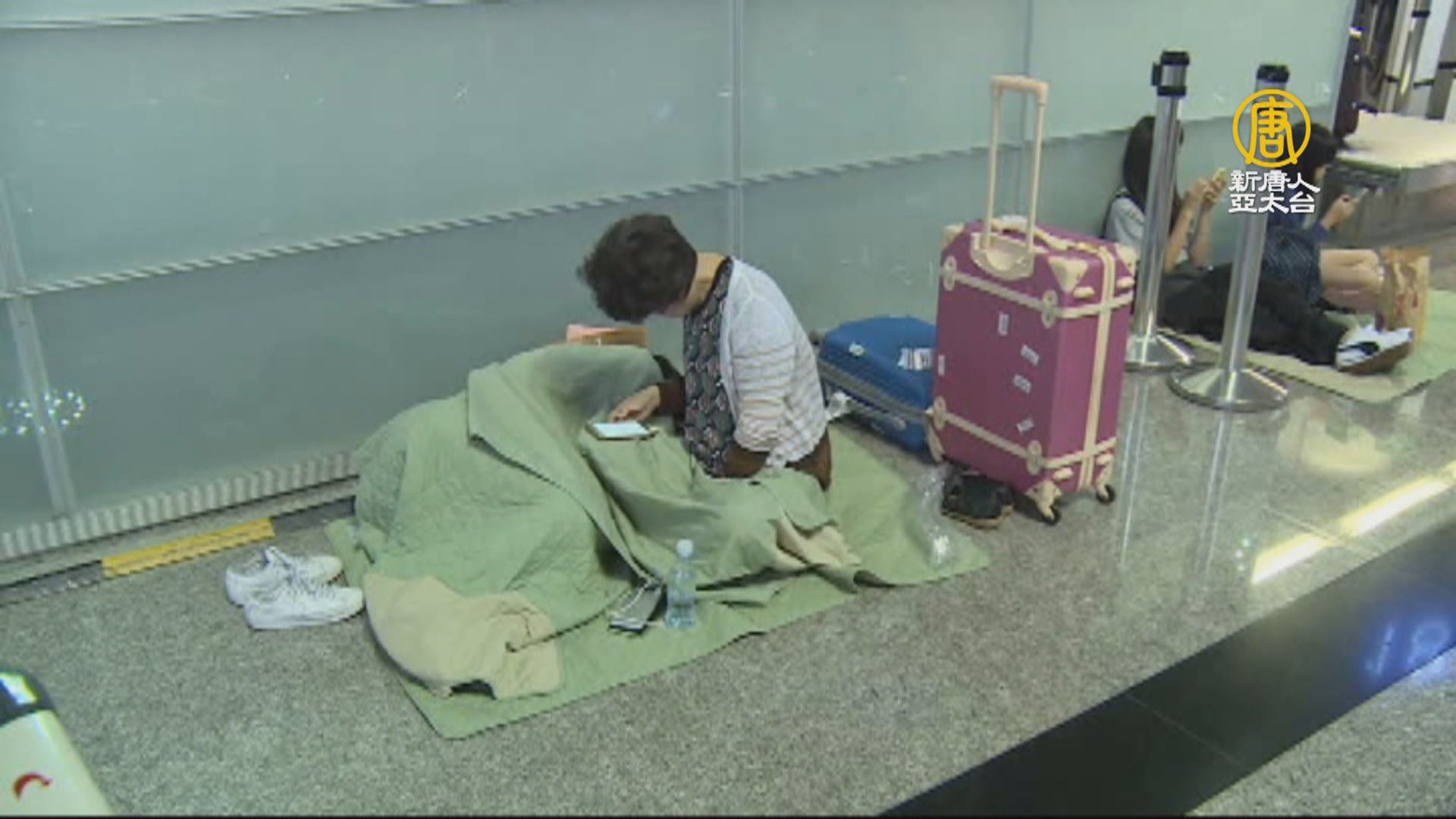 滯留機場的旅客,等待簽轉等得好累,只能在機場大廳打地鋪,稍作休息。長榮罷工風暴進入第三天,交通部長林佳龍在貝里斯接到消息,趕回台灣,周六清晨剛到,九點就回到交通部,和相關單位開緊急應變會議,在會後指出,預估在28日前,長榮可以維持四成運能。