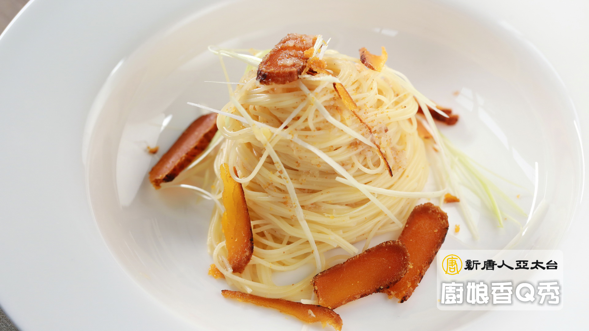 食材:天使細麵80g、烏魚子30g、紅蔥頭5克、白酒醋2大匙、魚高湯200cc、奶油少許