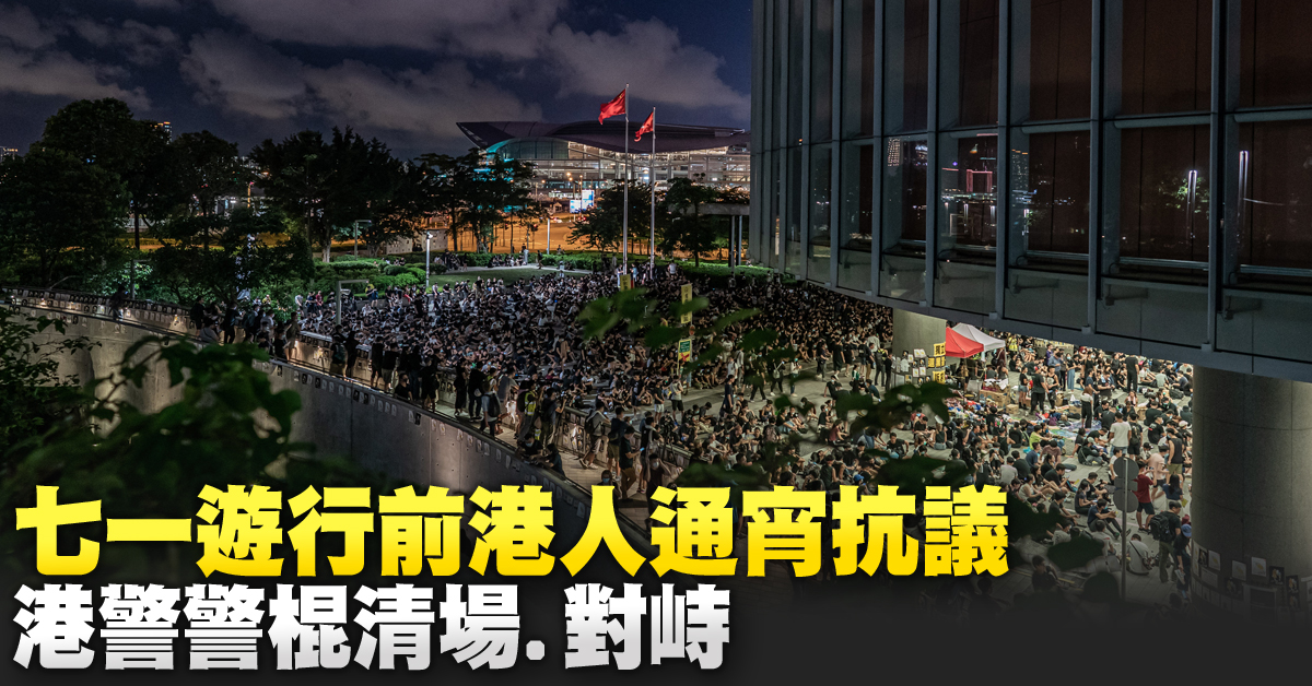 香港七一大遊行下午三點登場,前一夜已有大量市民聚集政府總部、立法會一帶,通宵守夜抗議。天還沒全亮,大批警察對峙,出動速龍小組強制清場,動用警棍、辣椒水、胡椒噴霧。