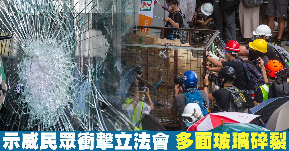 【新唐人亞太台 2019 年 07 月 01 日訊】香港七一遊行之前,部分群眾衝擊立法會,過程中多面玻璃碎裂,警方早先舉旗警告,並備齊盾牌、催淚彈,氣氛緊繃群眾衝擊立法會,可以看到建築物內警察持續戒備,稍早舉旗警告,現場可見員警配催淚彈。情勢一觸即發。