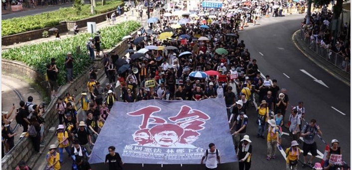 18:45 民陣遊行要求撤回修例及林鄭月娥下台。參與民陣遊行的市民,龍尾約在下午5時前離開維園中央,但不少人由天后港鐵站出來,直接加入遊行隊伍。今次本港一個月內第三次大遊行,訴求繼續是要求撤回修訂逃犯條例,要求特首林鄭月娥下台。在炎熱天氣之下,有多名遊行人士不適暈倒。