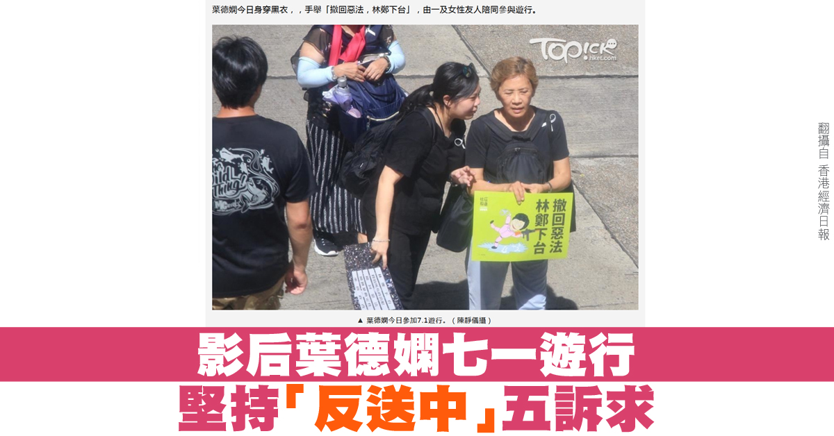 【新唐人亞太台 2019 年 07 月 01 日訊】今天的香港七一大遊行,有媒體發現,香港影后葉德嫻,今天也出現在遊行隊伍當中。葉德嫻接受媒體訪問時更表示,「反送中」五項訴求,一個不能少。葉德嫻向來關心社會,已經三次參加遊行,並指走出來是「理所當然,天經地義!」。她表示,對香港政府宣布暫緩《逃犯條例》修訂感到不滿,指出,香港市民不要「似乎」,而是要實在的東西。