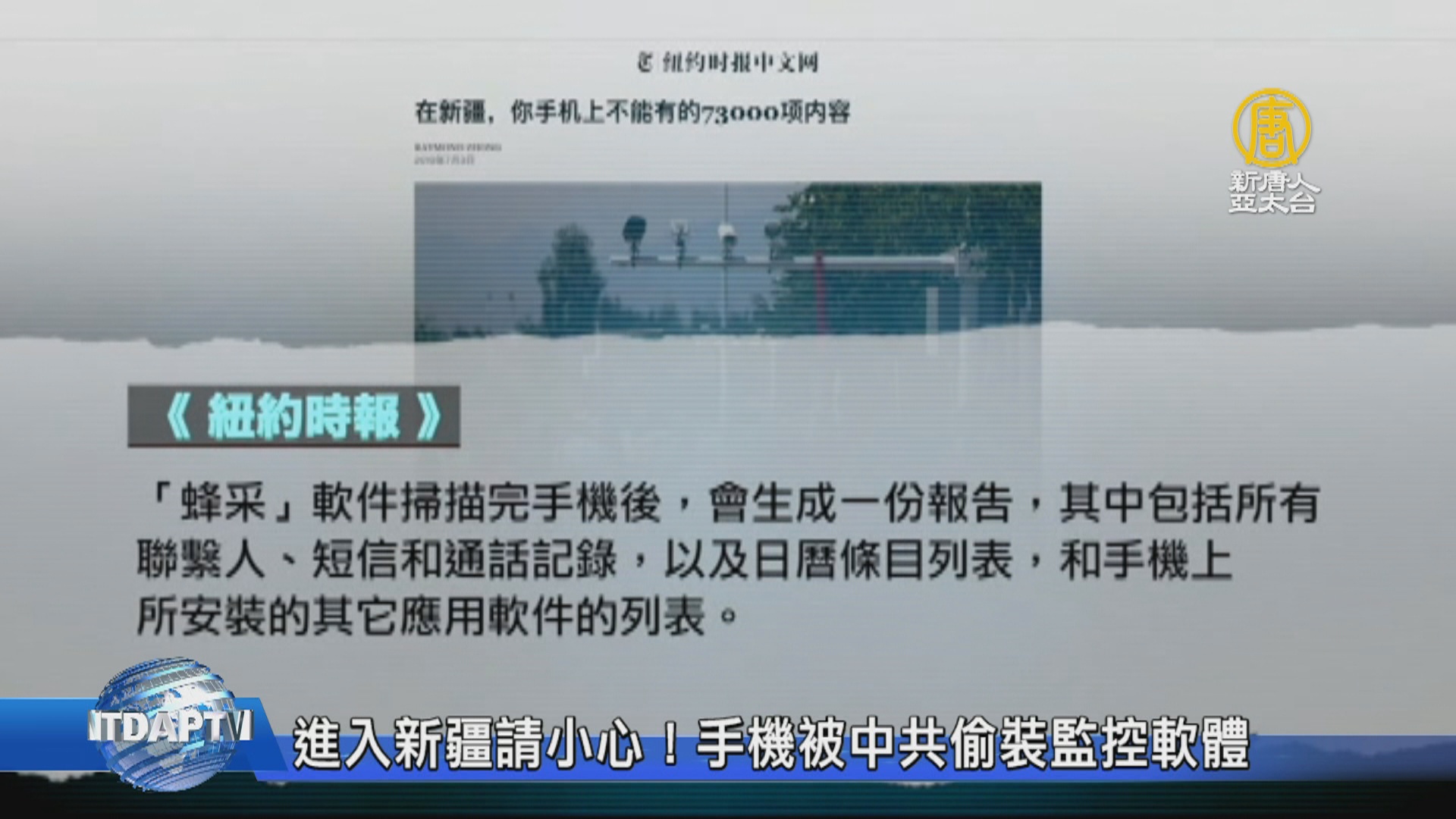 【新唐人亞太台 2019 年 07 月 06 日訊】今天的透視焦點,我們帶您關注,新疆的網路監控已經擴大到外地遊客身上,根據多家媒體的聯合調查,中國邊境警察,會在外來遊客的手機上,祕密安裝一款中國製的監控軟體,藉此擷取手機內的個人信息,做為監控追蹤之用。