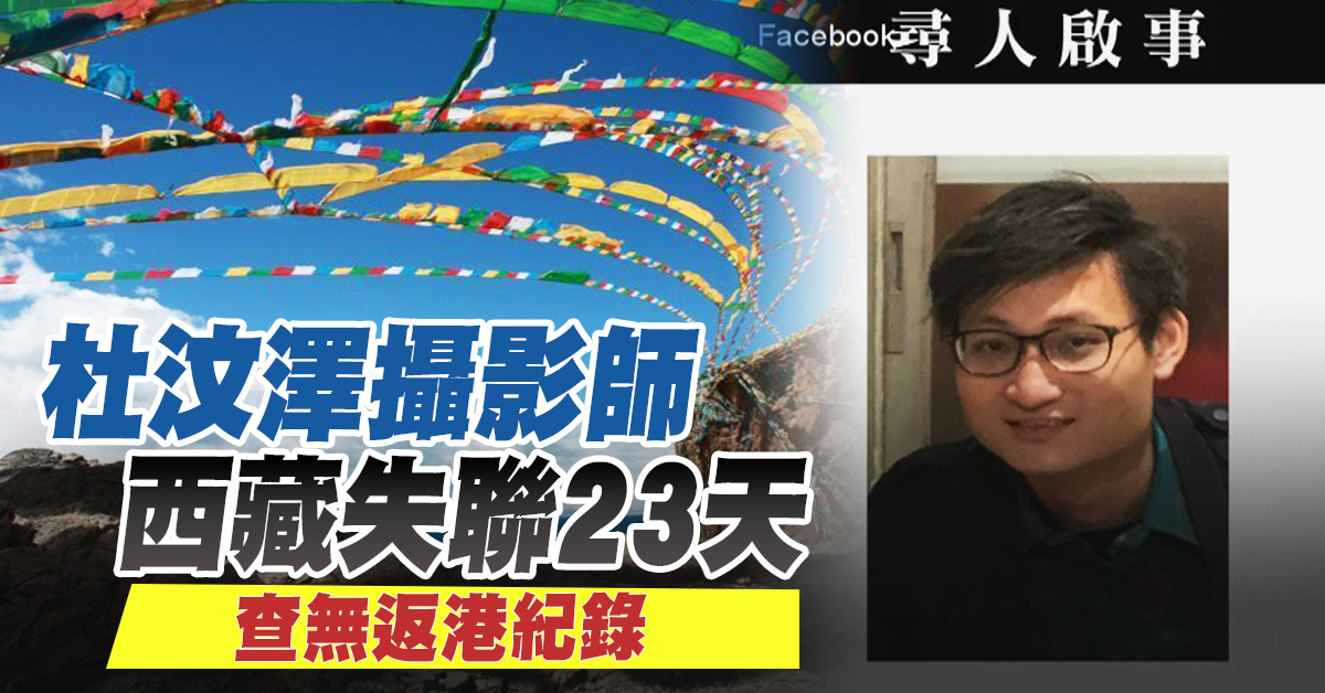 【新唐人亞太台 2019 年 07 月 09 日訊】好,儘管香港特首林鄭月娥稱修例工作失敗,逃犯條例已壽終正寢,但仍有港人失蹤消息頻傳,近日聲援「反送中」的港星杜汶澤,今天他在自己的臉書粉絲團發出一則尋人啟事表示,他旗下的攝影師簡漢鋒,在西藏已經失聯23天,最後出現的地點在拉薩,目前還沒有查到返港紀錄,因此杜汶澤希望網友幫忙留意。