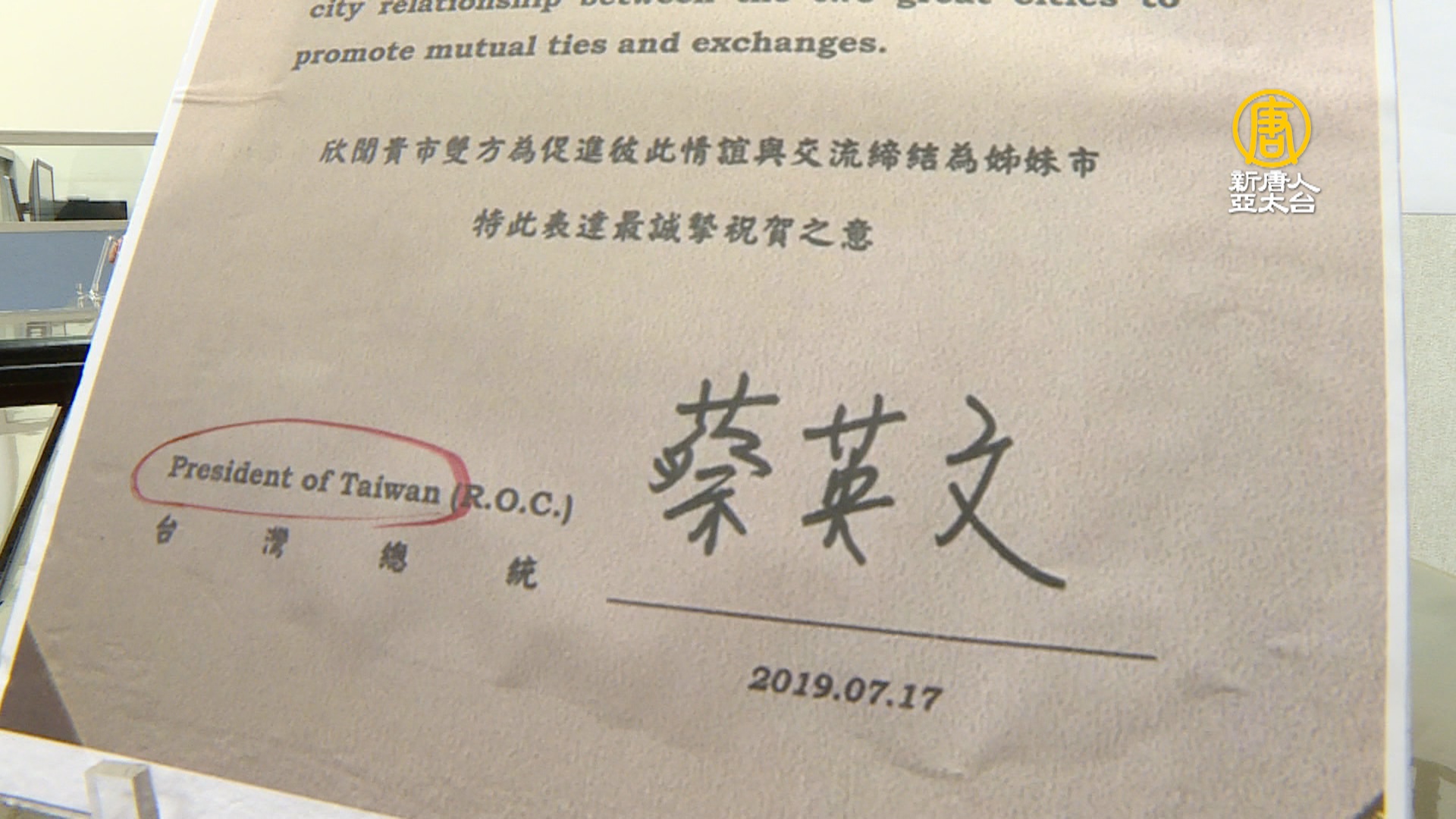 【新唐人亞太台 2019 年 07 月 09 日訊】宜蘭市和美國洛克維爾市簽署姊妹市,請蔡總統簽賀文,不過用字上,用President of Taiwan,而不是ROC,這讓國民黨立委質疑,認為這樣已經更改了國號,不過總統府強調,這是宜蘭市府準備的賀文,而且國際上對台灣都用台灣來稱呼,不必政治解讀。