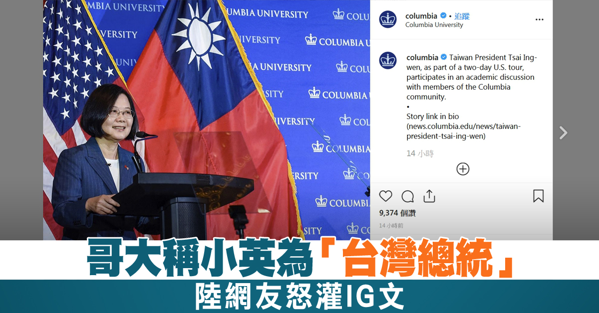 哥大稱小英為「台灣總統」 陸網友怒灌IG文