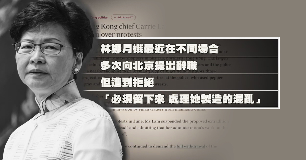 英國《金融時報》引述消息人士說,林鄭月娥最近在不同場合,多次向北京提出辭職,但遭到拒絕。北京要求她「必須留下來處理她製造的混亂」。