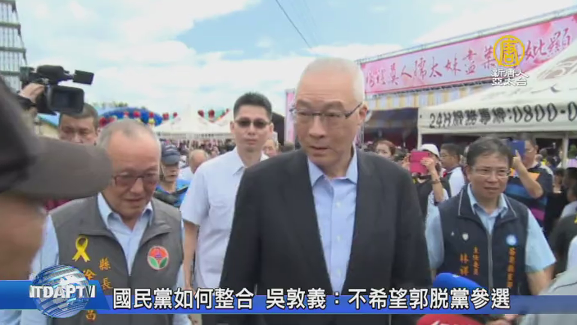 【新唐人亞太台 2019 年 07 月 18 日訊】韓國瑜出線後,國民黨要如何團結整合,郭台銘動向備受矚目,吳敦義上午在苗栗,就對郭台銘溫情喊話,不希望他脫黨,而被問到黨內刪除總統兼任黨主席,他說總統參選人是由民調產生,而主席是由黨員投票,這次只是把過去的規定再更改回來,沒有針對任何人。