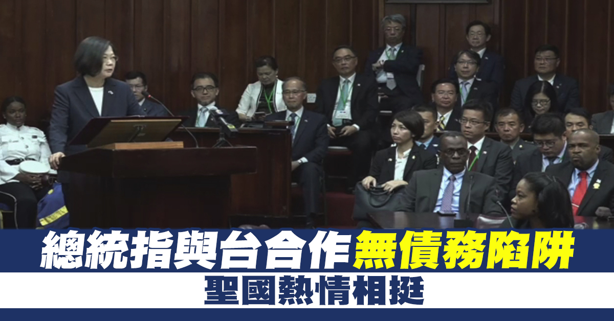 總統蔡英文在聖露西亞國會演說,對於聖露西亞的政府官員,在國際上為台灣發聲,表達感謝。還提到,台灣投入聖露西亞基礎建設,用互惠互助的合作模式,不會有債務陷阱問題。