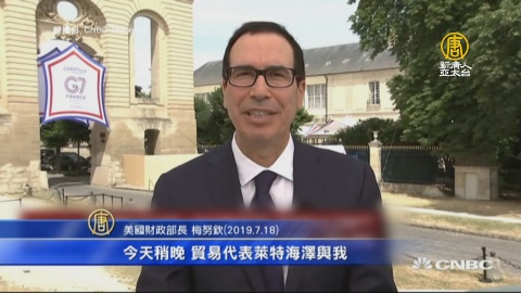 【新唐人亞太台 2019 年 07 月 19 日訊】美國財政部長梅努欽18號接受媒體採訪時表示,美中兩國代表表定在18號進行一場電話會談。梅努欽並表示,如果電話會談持續取得進展,預計他與美國貿易代表萊特海澤將前往中國,進行面對面會談。目前,中共商務部也證實,雙方已經在18號進行通話。