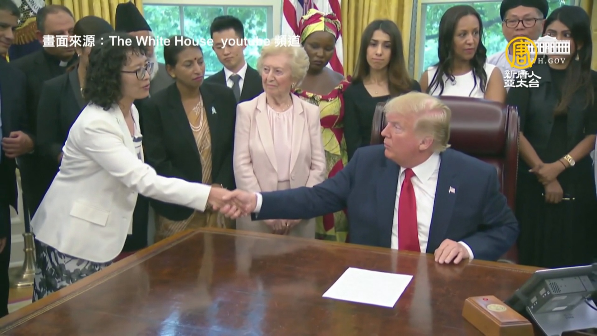 當天向總統陳情的包括來自中國的法輪功學員張玉華女士。這是川普總統第一次在白宮正式會見遭受中共迫害的法輪功學員。