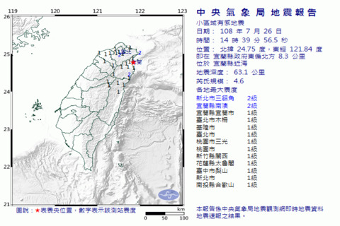 【新唐人亞太台 2019 年 07 月 26 日訊】今天(26日)下午2點39分發生發生有感地震,根據中央氣象局的地震報告指出,這起地震的震央位於宜蘭縣政府東偏北方9.3公里,芮氏規模4.6,震央位於宜蘭縣近海,地震深度63.1公里,最大震度2級。