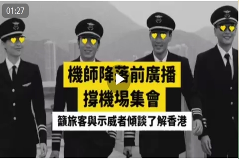另外,昨日一班從東京返港的飛機上,機長在降落前廣播,向乘客介紹在機場的「反送中航空界集會」。機長表示,這是一場和平有序的反送中集會,旅客可以與集會人士了解一下香港現況。最後以廣東話勉勵港人「香港人加油,萬事小心。」