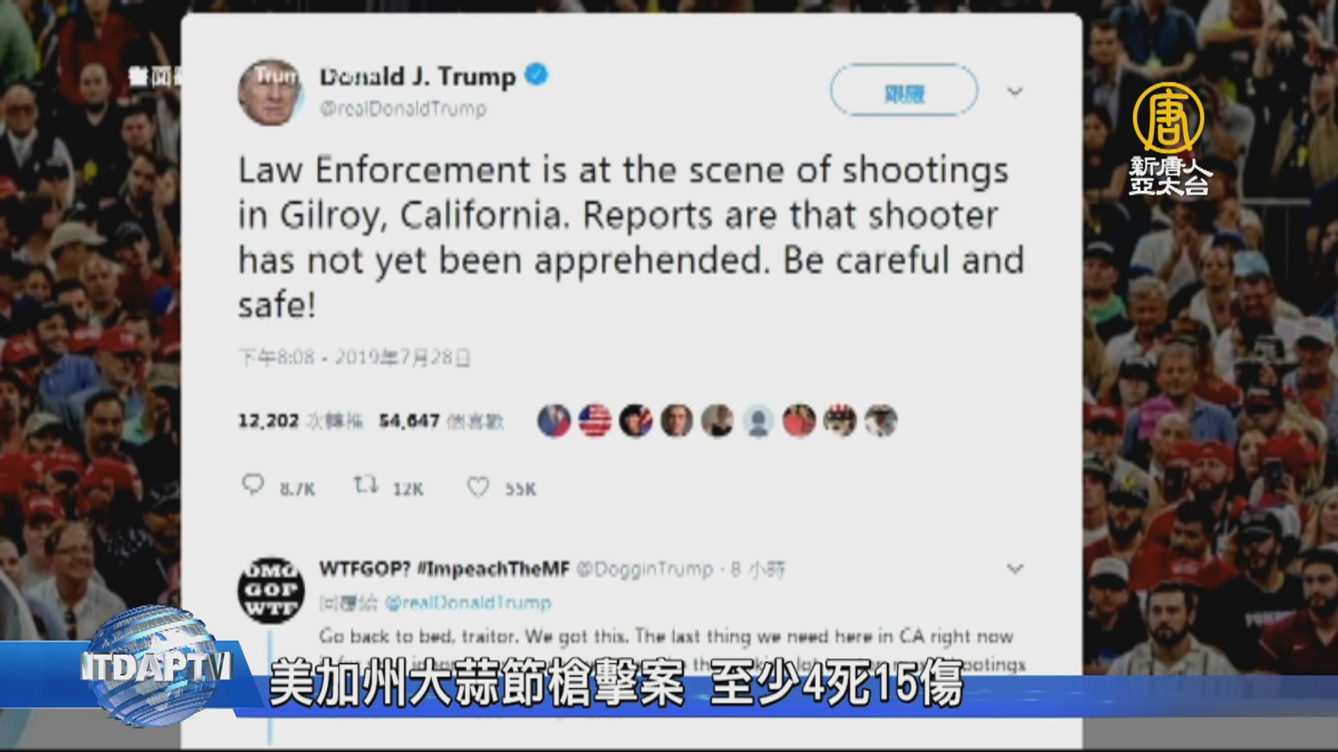 【新唐人亞太台 2019 年 07 月 29 日訊】歡迎回來,帶您關心,美國加州舊金山一年一度的「大蒜節」,昨天(28日)傍晚驚傳槍響,至少有2名槍手,開槍射擊人群,造成包含槍手在內4人死亡,至少15人中彈受傷。外交部表示,駐舊金山辦事處已連繫美方相關警政單位,目前確認沒有台灣人傷亡。