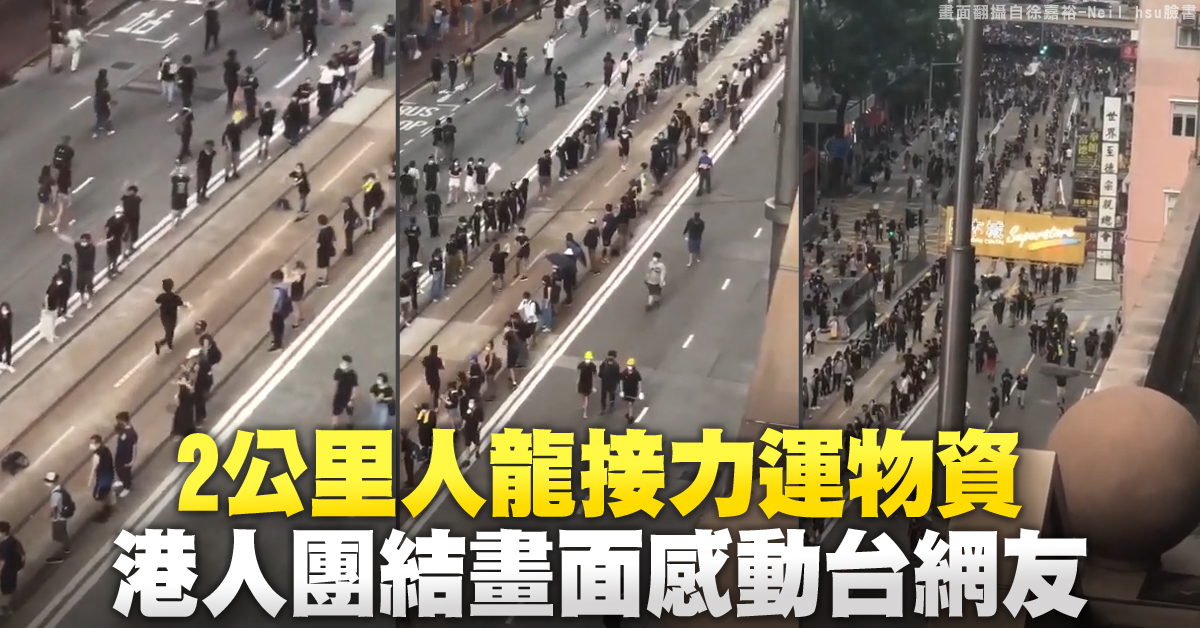 台灣網友分享一段影片,因為交通被阻斷,身穿黑色T恤的抗議民眾排列在馬路上,形成人龍,示威者奔跑接力傳送物資到前線,推估這段距離約超過2公里,這段畫面感動不少台灣網友,紛紛留言,佩服香港的團結,為香港加油打氣。