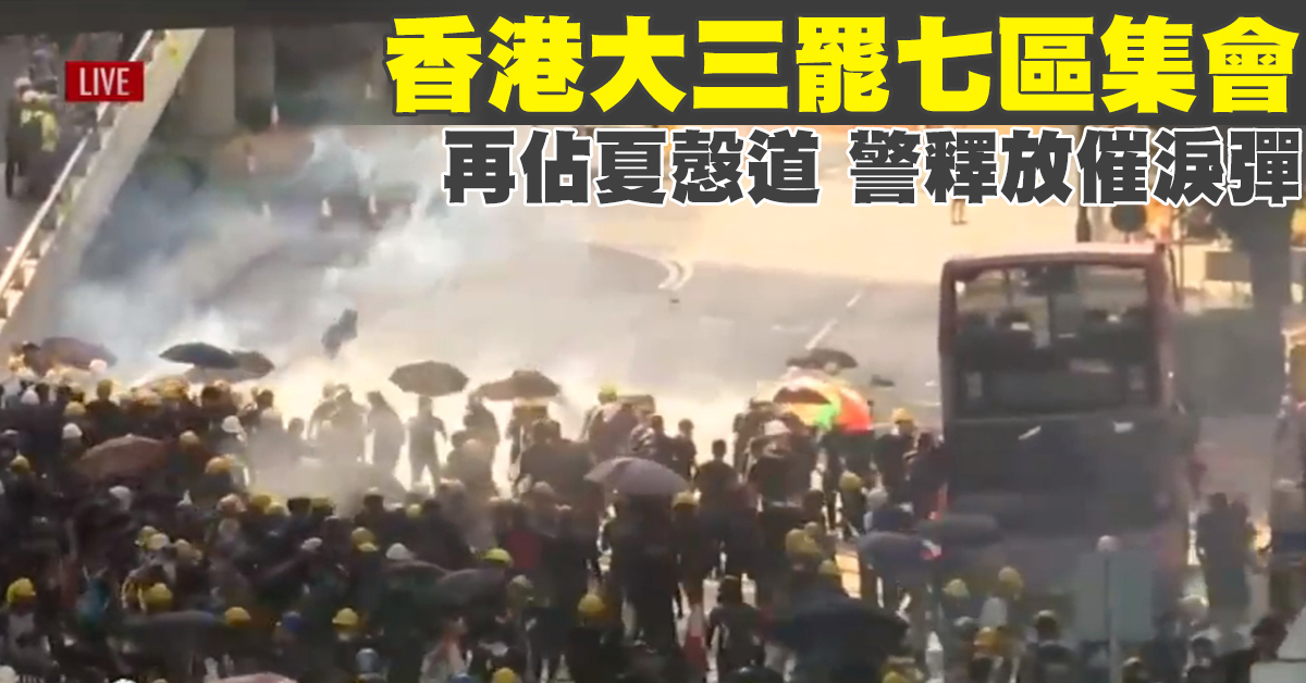 香港大三罷七區集會 再佔夏慤道警釋放催淚彈