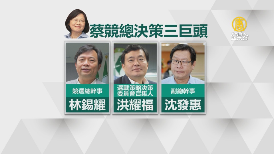 蔡英文競總決策三巨頭,包括前行政院副院長林錫耀擔任總幹事,肩負操盤手的重責大任;前民進黨秘書長洪耀福,出任選戰策略決策委員會召集人,主導選戰決策;另外民進黨中常委沈發惠,擔綱副總幹事,負責組織。