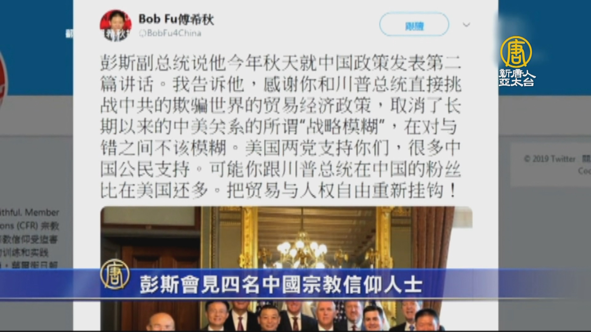 彭斯在會面中重申了川普政府的承諾,堅持與世界各國宗教信仰者站在一起,其中包括中國。