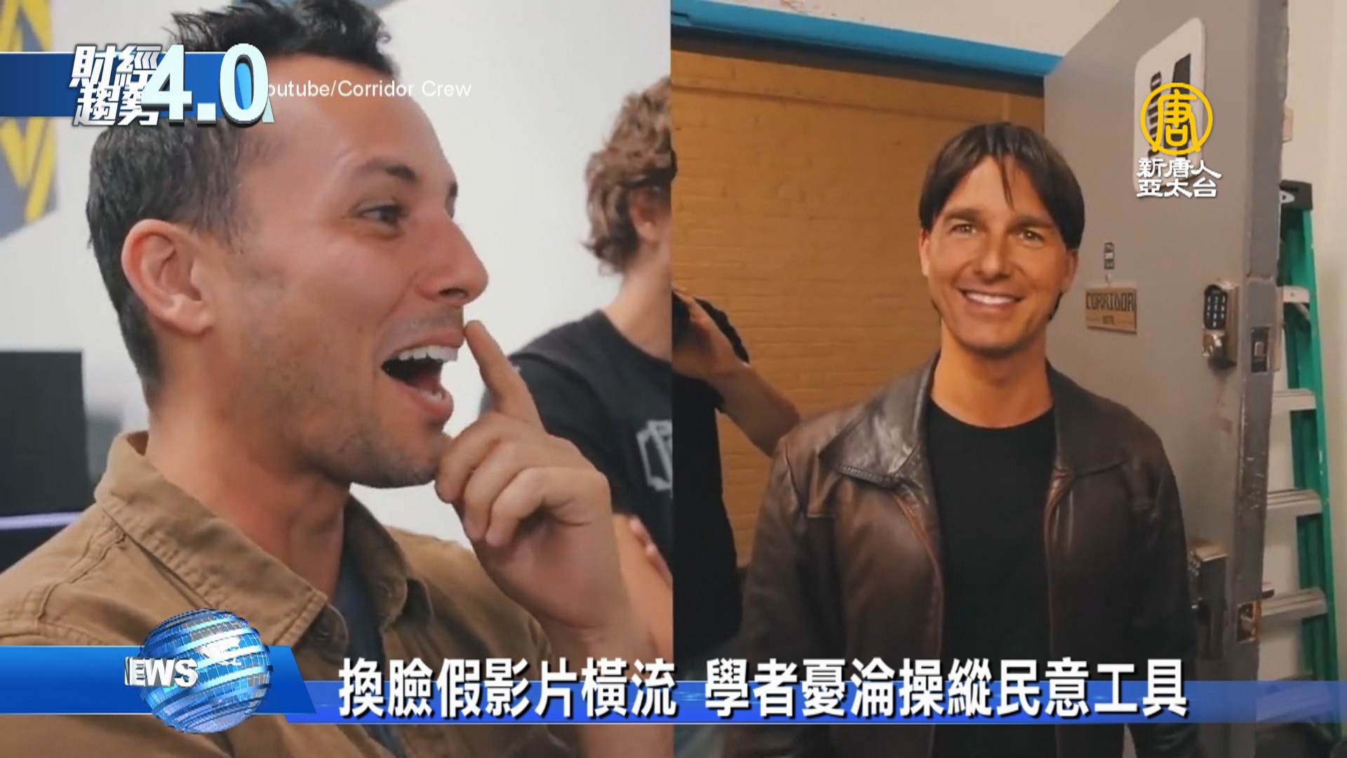 國外YouTube頻道《Corridor Crew》:「來一杯水,順便來份煙燻牛肉三明治,謝謝。」不經意看,還以為眼前這位是好萊塢巨星湯姆克魯斯,但他其實是左畫面中的男子,到底怎麼做到的?這正是一項AI「換臉」技術。