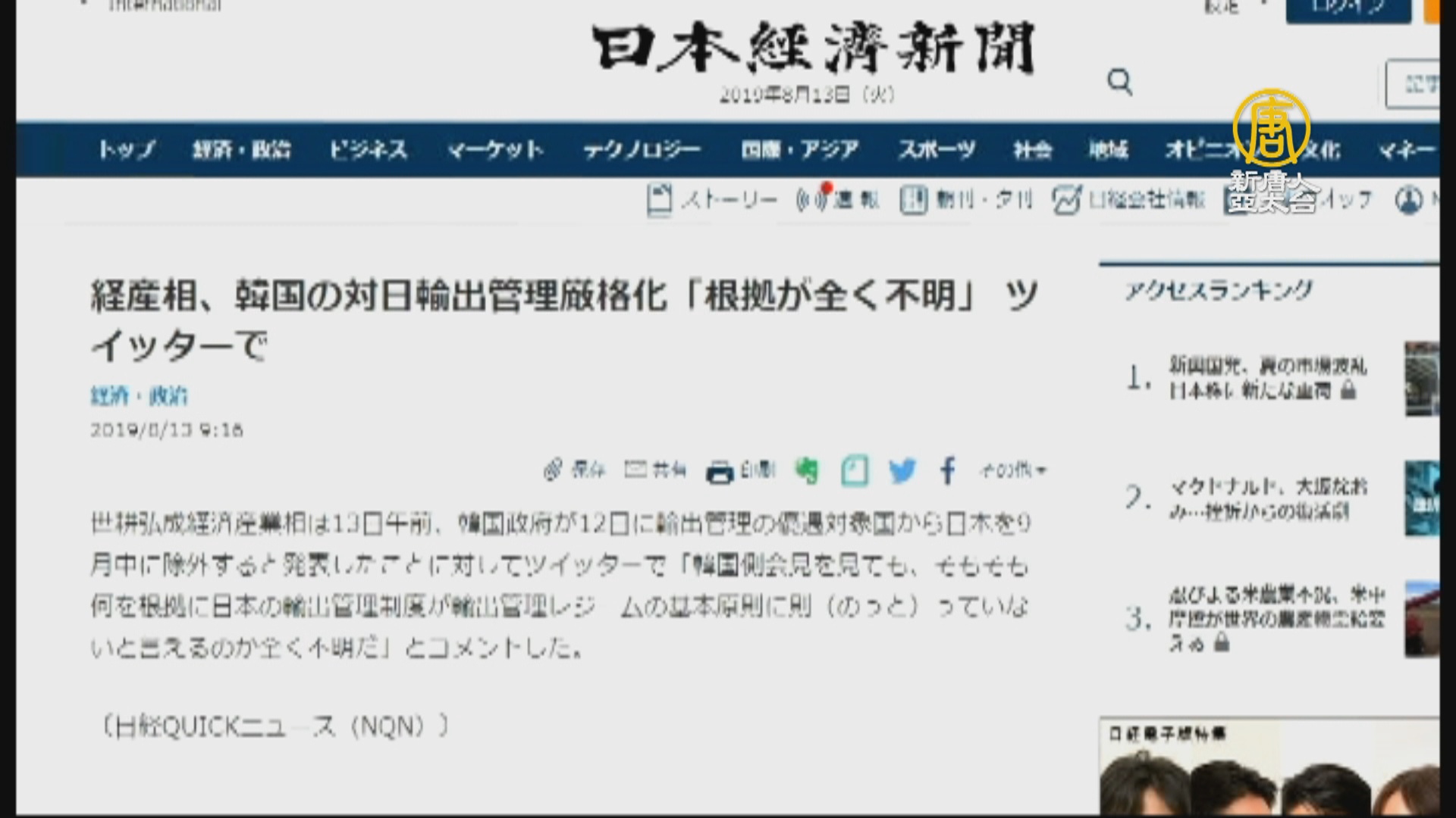 【新唐人亞太台 2019 年 08 月 13 日訊】接著來看日韓貿易戰的最新進度,對於南韓昨天將日本移除出甲類白名單,日本經濟產業省也在今天上午做出回應,指出南韓的這項舉動毫無根據。