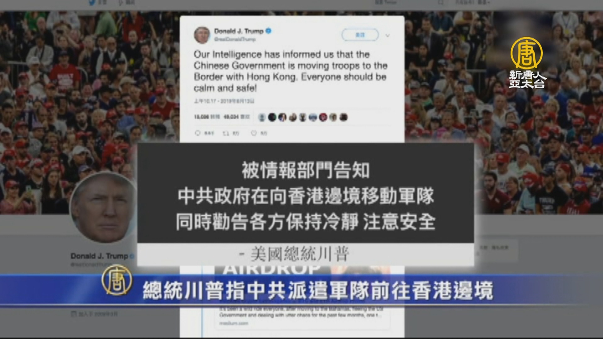 【新唐人亞太台 2019 年 08 月 14 日訊】美國總統川普發推文指,已經得知中共正在向香港邊境增派軍隊,他呼籲相關各方保持冷靜。