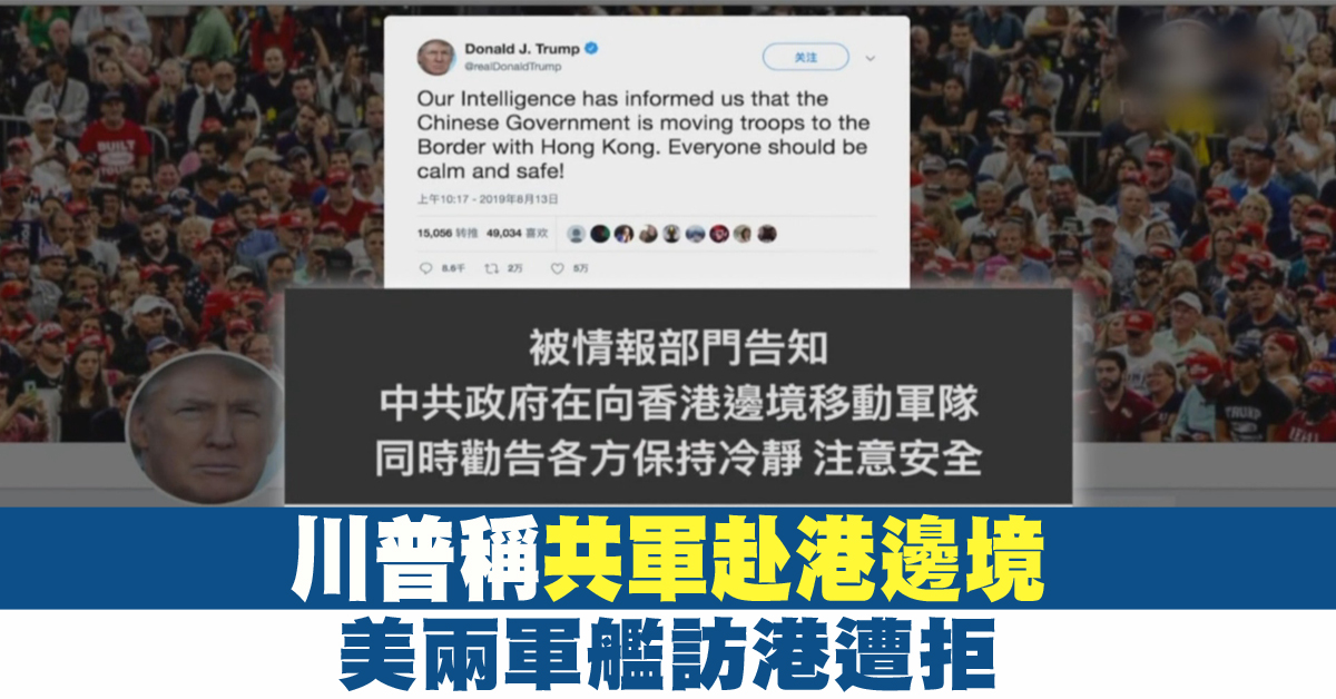 【新唐人亞太台 2019 年 08 月 14 日訊】香港局勢緊張,美國總統川普發推文指,已經得知中共正在向香港邊境增派軍隊,他呼籲相關各方保持冷靜。另外,有消息指出,美方提出要求,讓兩艘軍艦在未來幾週訪問香港,不過都遭到拒絕。