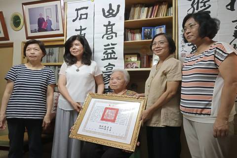 褒揚令由黃羣英遺孀蔡春燕代為接受(桃園市立美術館提供)