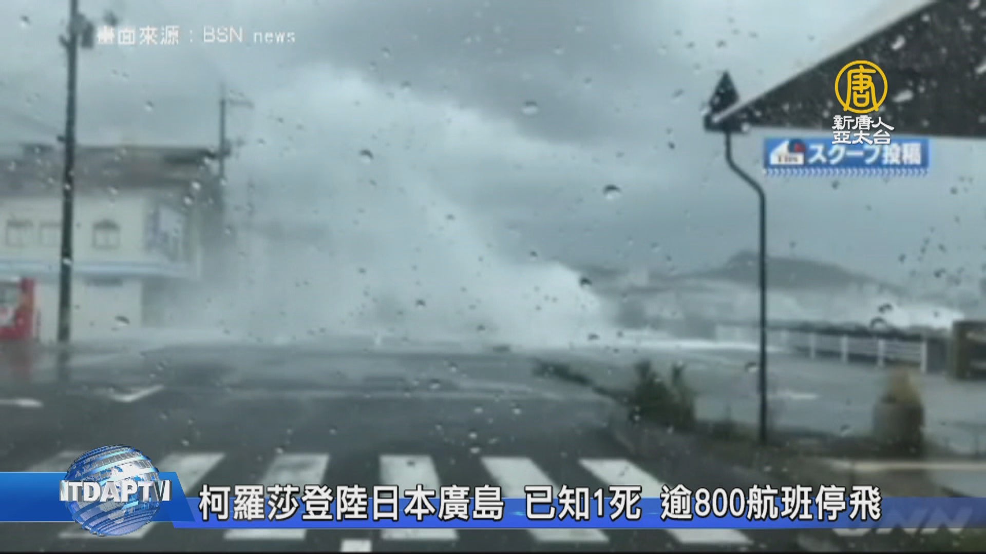 BSN news:「下午三點左右,在廣島吳市附近登陸的大型颱風十號(柯羅莎),從上午開始,就在各地吹起了強風。」